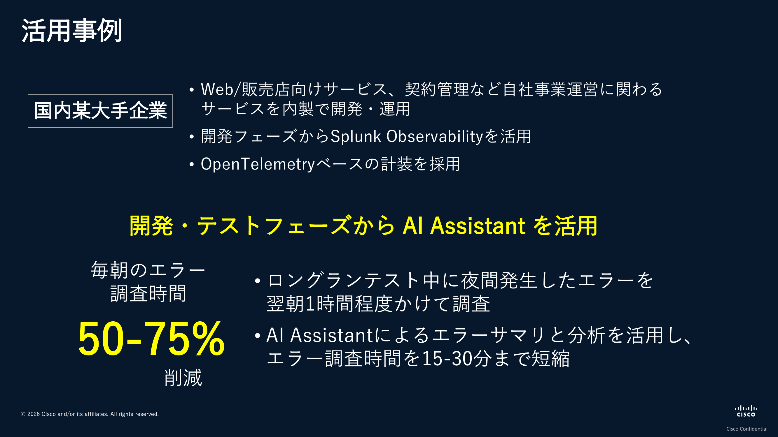 AI Assistantにサマリーをさせて、特に問題になりそうなものについては原因分析まで実行させる形にした結果、毎朝のエラー調査時間を15〜30分まで短縮し、50〜75%の削減を実現されました。データを整えてSplunkに蓄えていただければ、こうしたサービスを活用して皆様の内製開発を支えていくことができると考えています。