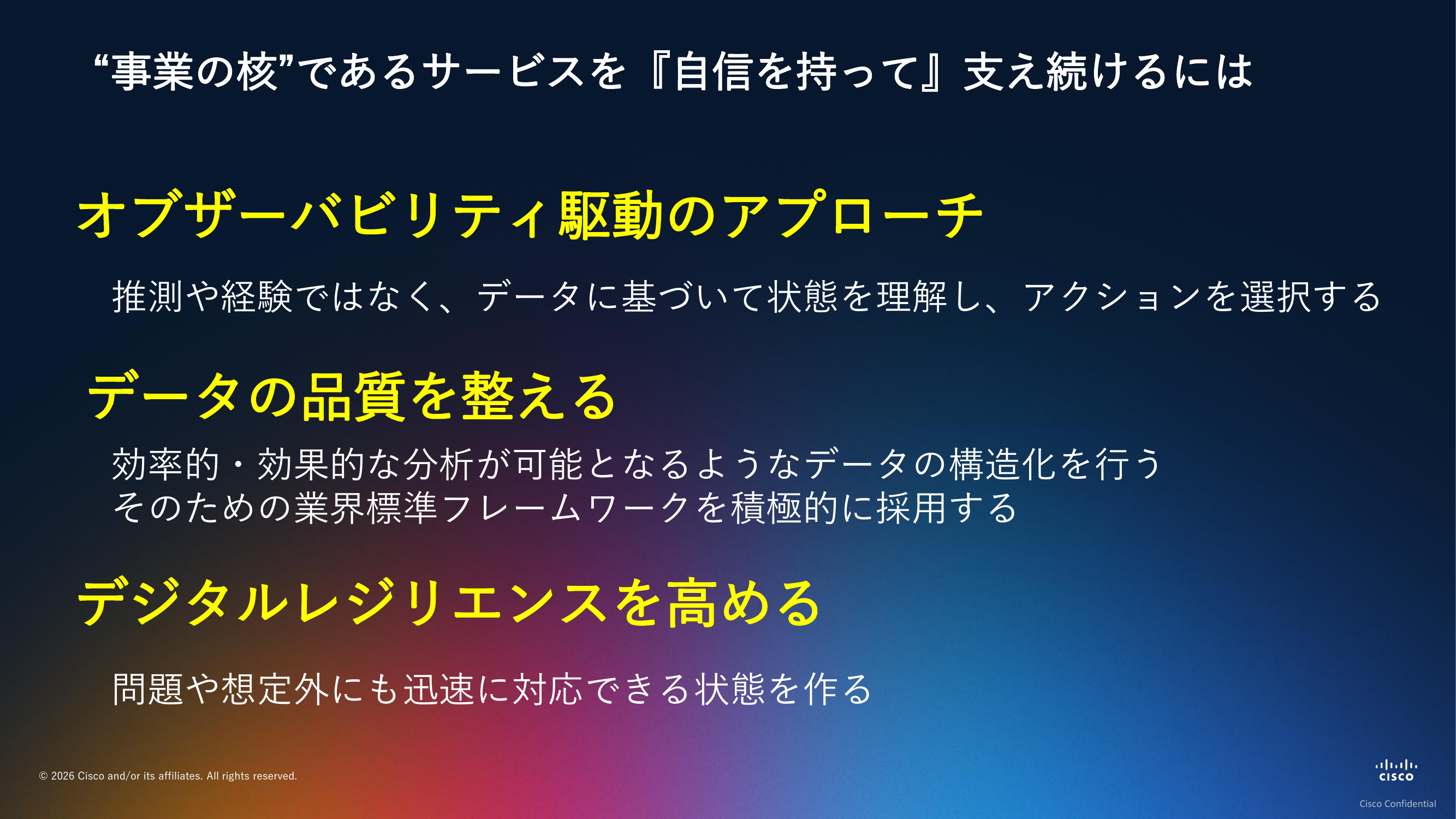 皆様がこれから開発していく、あるいは今開発されている事業の核となるサービス。これをユーザーから信頼を得られるものとして支え続けていくには、オブザーバビリティ駆動のアプローチが必要です。推測や経験ではなく、データに基づいて状態を理解し、アクションを選択する。様々な判断を要する場面において、正しく状態を理解して自信を持って対応できるようにしていくためのアプローチです。
