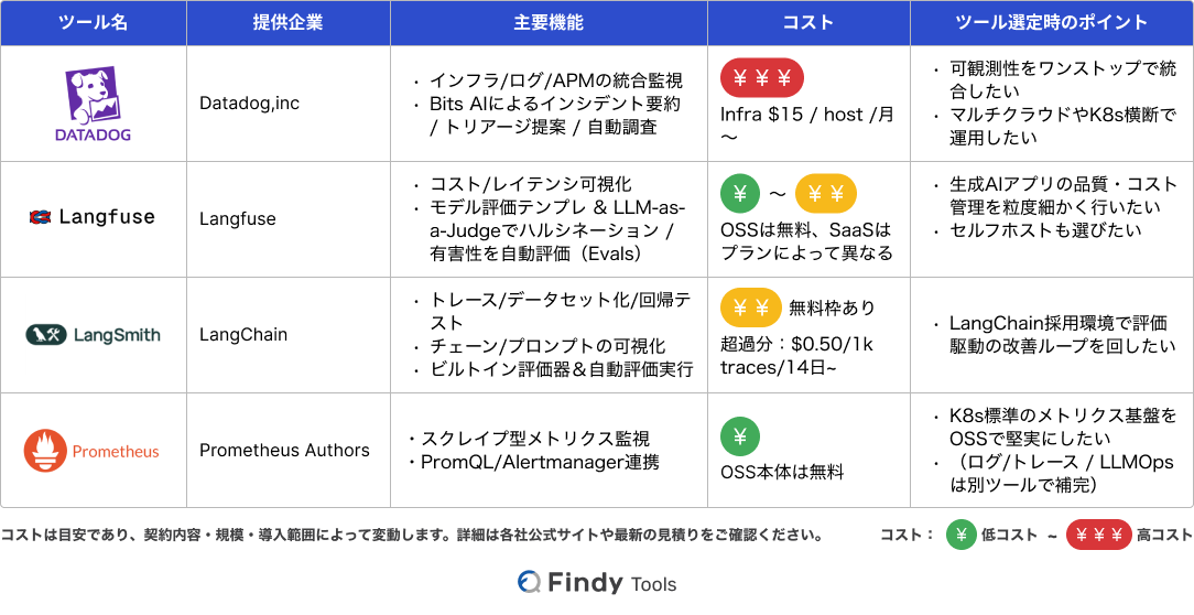 本記事では、オブザーバビリティツールの機能比較を行った上で、LLMOps活用の最前線に立つ4社のリアルな事例を通じて、AIとオブザーバビリティをどのように実践していくのか、そのロードマップを読み解きます。少しでも皆さんのツール検討に役立てていたら幸いです。