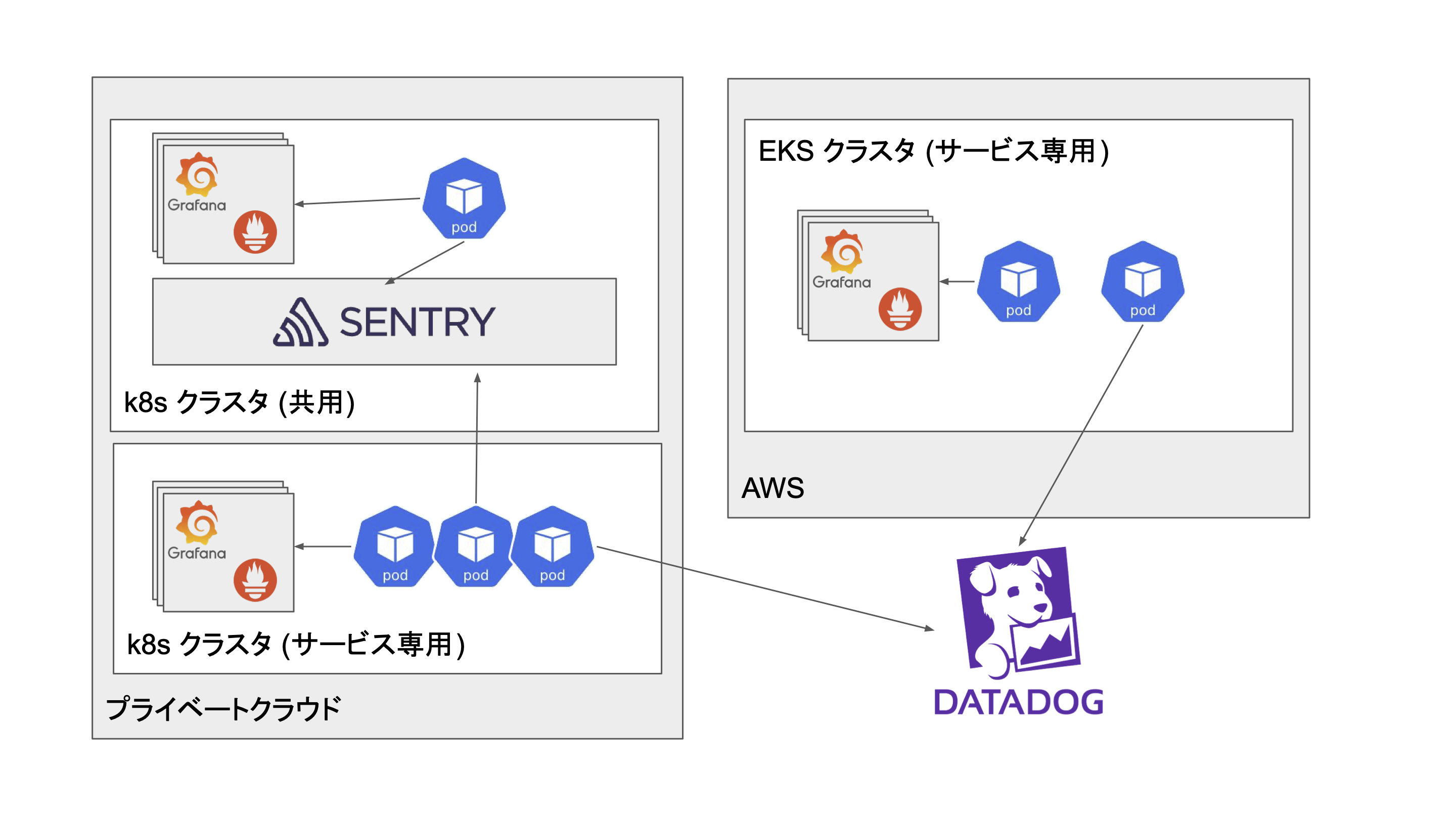 オブザーバビリティツールとして、用途に応じてDatadogとGrafana Labs が開発する Grafana, Loki, Tempo といった OSSツール群を使い分けています。各サービスの本番環境ではDatadogをメインに採用し、データの統合による恩恵を受けています。一方、高トラフィックであり Datadog をヘビーに活用するとコストがかかりすぎてしまうようなサービスに対し、Self-hosted Sentry を提供し、社内で使用する Bot や運用ツールなどには OSSツール群を Kubernetes クラスタ上でアドオンとして提供しています。用途別にツールを使い分けることにより、すべてのシステムに対し可観測性を高めるアプローチを取ることが可能となっています。