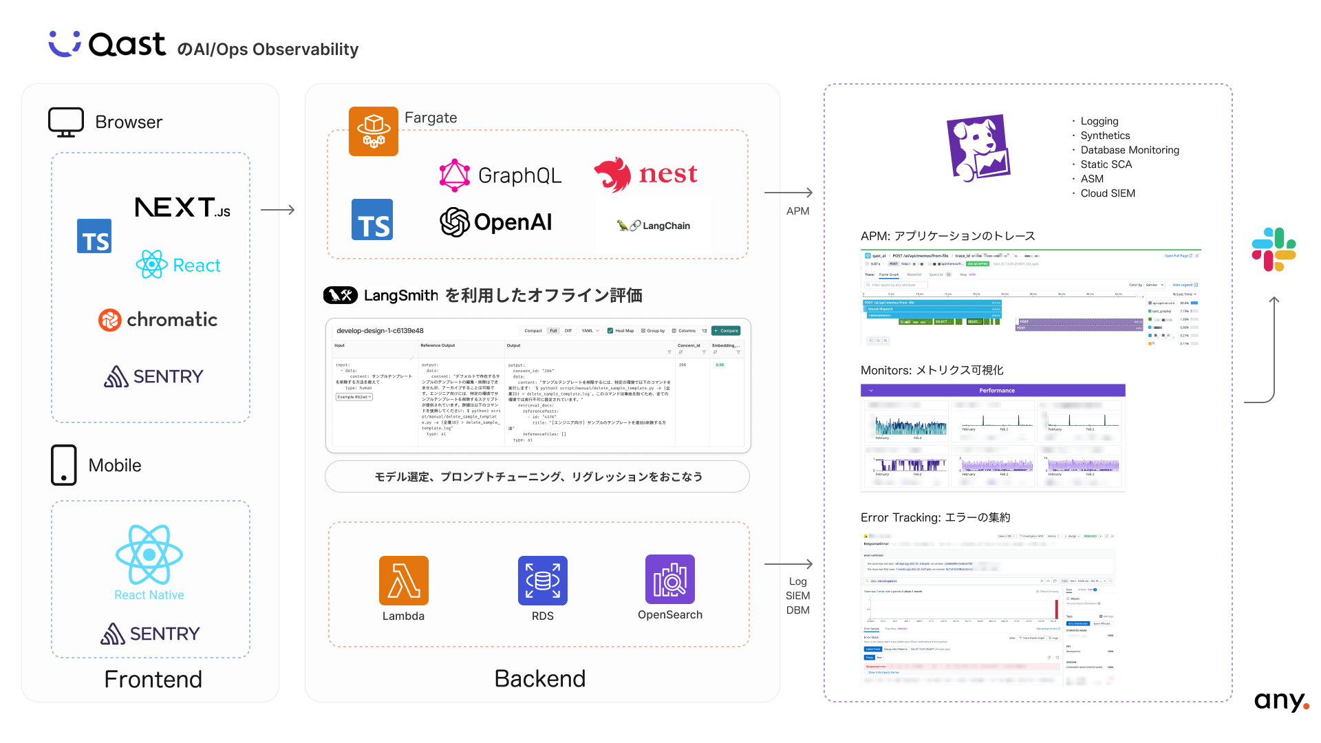 弊社プロダクトの「Qast」は、B2B SaaSのWebアプリケーションで、インフラ環境としてAWS上にて構築されています。バックエンドの複数のサービスがマイクロサービスとして、Fargate on ECSで構築されており、全体の処理のほとんどがマイクロサービス間通信で占められています。Qastの開発に関わるメンバーはすでに20名を超えており、こういった分散アプリケーションのObservabilityを高めることは、AIに限らず日常的な運用を効率化するうえでは急務でした。