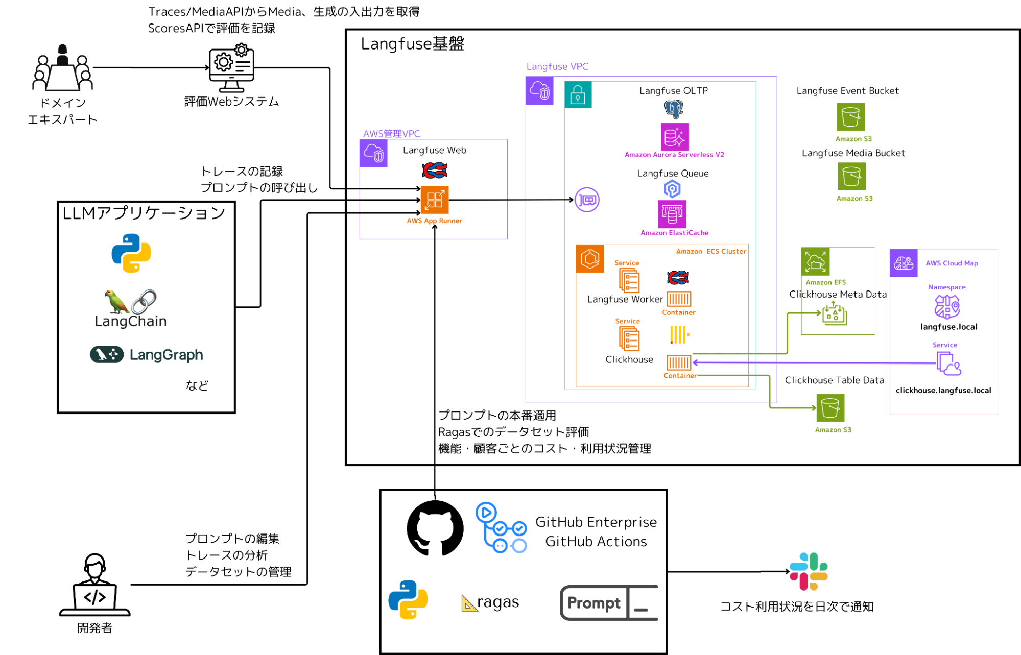Langfuse選定の最大の決め手はセルフホステッド運用が可能な点でした。LangSmithもセルフホステッド版がありますが、エンタープライズライセンスが必要であるのに対し、LangfuseはOSS版が利用できるため、セキュリティ要件を満たしながらコストメリットを享受できました。技術的な観点では、ObserveデコレーターをはじめとするLangfuse SDKの充実により、観測したい関数にデコレーターを付けるだけで比較的手軽に可視化を実装できる点も高く評価しました。LangChainやLangGraph専用のCallbackも提供されており、実装の簡便性が他ツールと比較して優れていました。