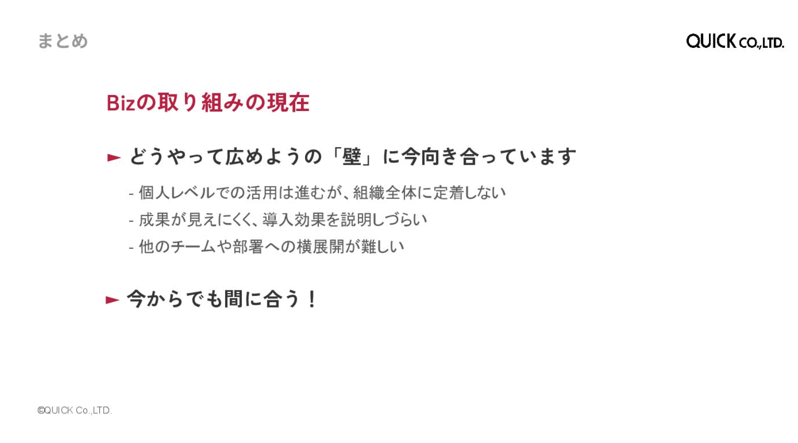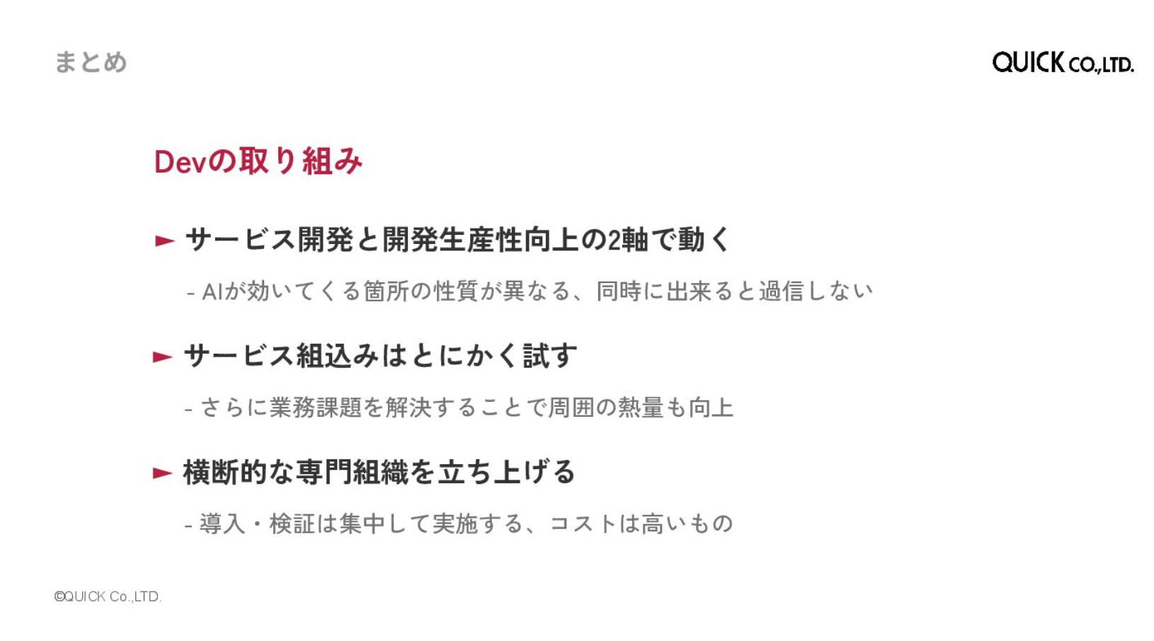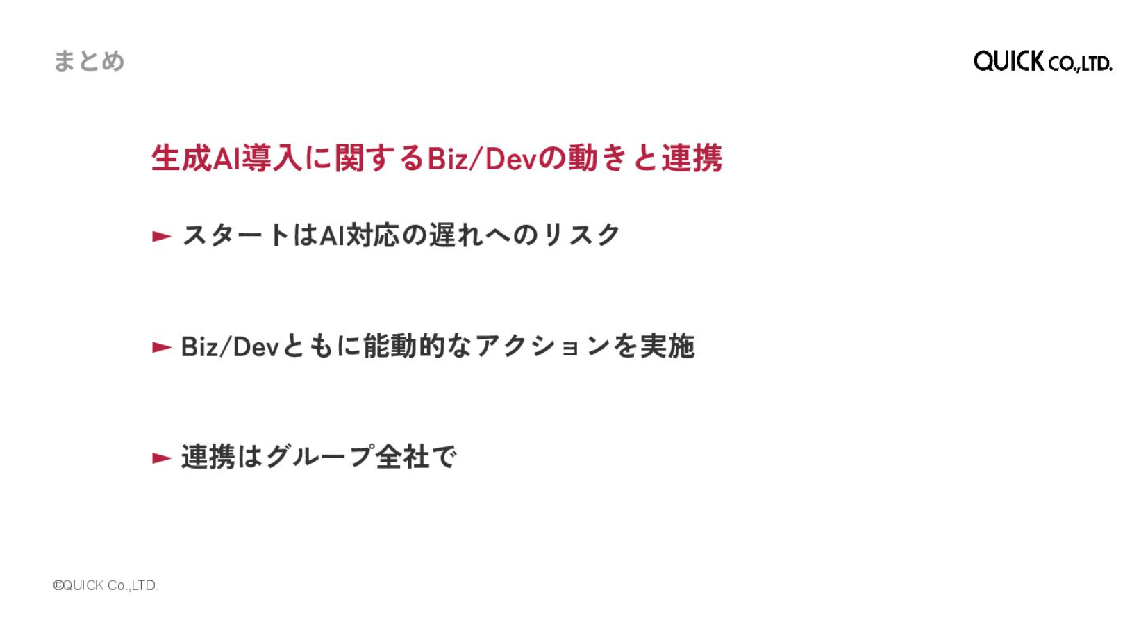 全体についてもまとめます。私たちは「自分たちのAI対応は遅れている」と自認するところから始めています。そこから、Biz/Devがそれぞれ自分たちに必要なものを見ながら、各自能動的なアクションを実施してきました。その途中でもお互いに情報連携はしていましたが、これからは独立して進めるのではなく連携して全体でさらに推進していこうと考えています。