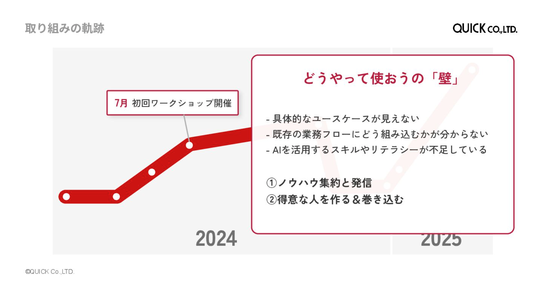 ワークショップもリスタートさせ、今度はあえて初心者向けに開催することで最初の波に乗り遅れた方々をキャッチアップしました。すでにAIアンバサダーという仲間がいたため、ここでは乗り遅れていた人たちのキャッチアップに集中できたことが、非常に良い伏線だったと考えています。