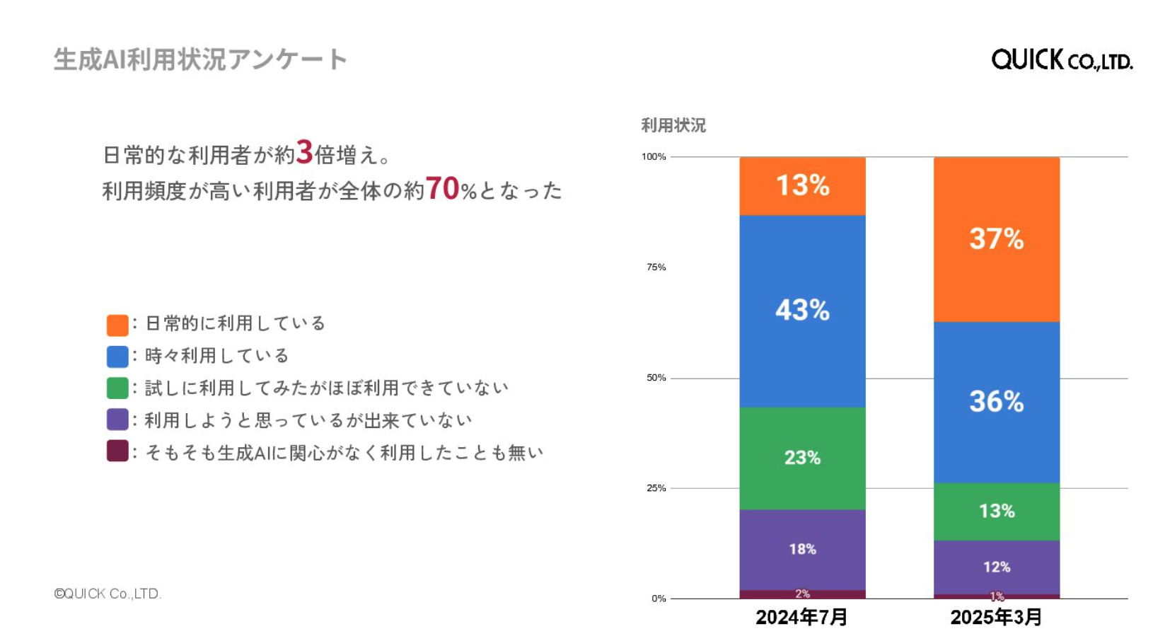 2024年7月時点では日常的な利用者が13%でしたが、2025年3月には37%という数字が出ており、Geminiの利用開始からわずか2カ月で3倍に増加していました。「時々利用している」層を合わせると約7割が日常的あるいは頻度高くGeminiを使っている状況です。これは、我々が取り組んできた1年間の成果が出ていると考えています。