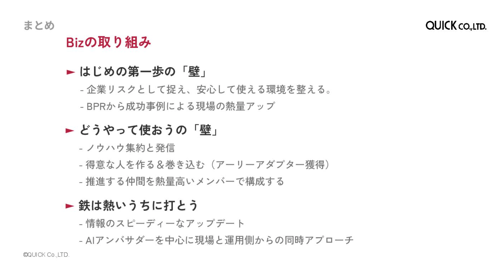 Bizの取り組みをまとめます。はじめの第一歩の「壁」は、AI利用の遅れが企業リスクになることを経営層に提言することがキーワードでした。そして、最初に「AIはすごい」という印象を組織に植え付ける成功事例ができたことがとても大事だったと思います。