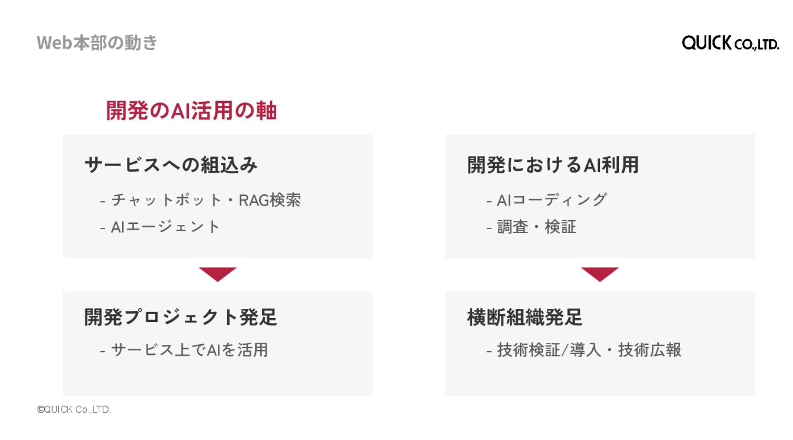 これらは並行して進める必要があると考え、サービスへの組込みについては愚直に開発プロジェクトを発足し、開発におけるAI利用については横断組織を発足して技術検証や導入方法を検討しています。