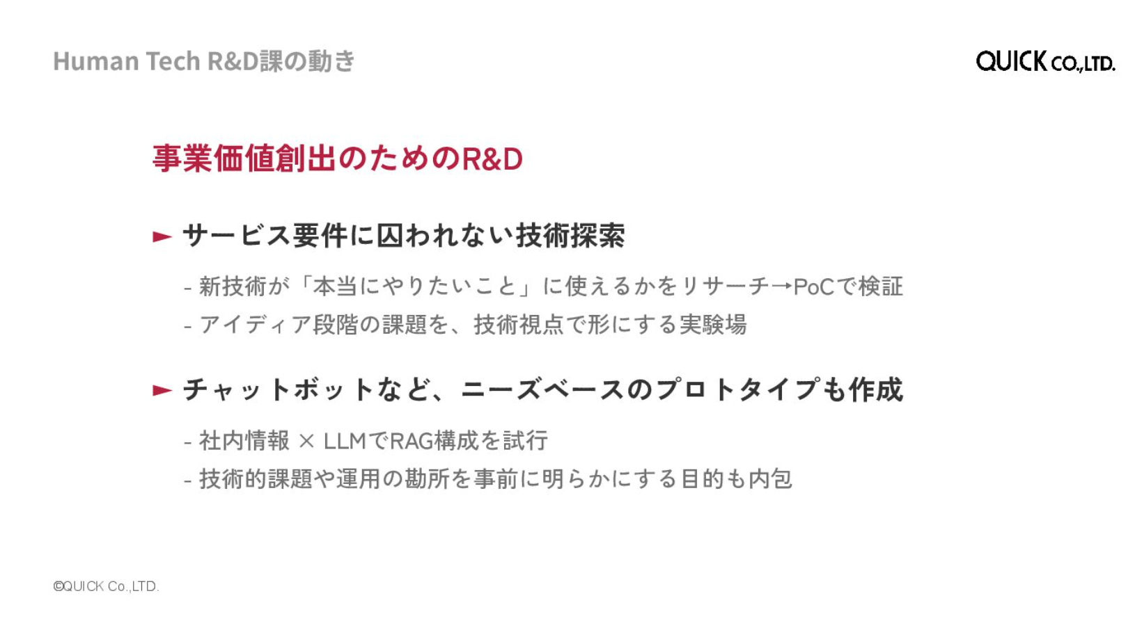 事業価値創出のためのR&Dも引き続き行っており、新しく出てきたAI系の技術が「本当にやりたいこと」に利用できるかをリサーチし、プロトタイプを作って実験しています。この点についてはまだ形にできるものが少ないため、アーキテクチャカンファレンスのような場でご紹介することを目指し、開発を進めているところです。