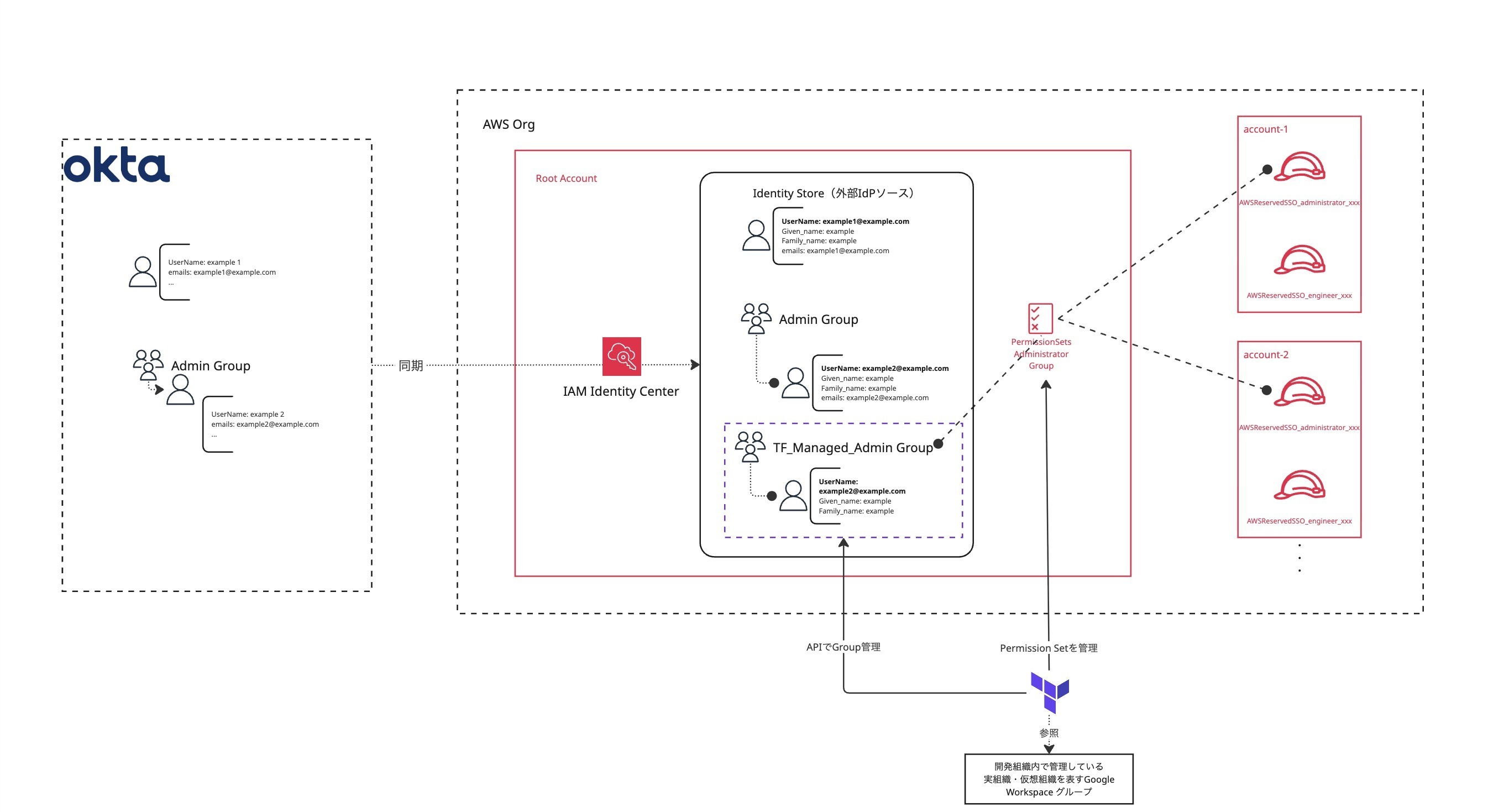 導入タイミングが全社的なIdP刷新の過渡期と重なったため、IdP(Okta)側のユーザーグループ情報をそのままAWS権限管理の正(ソース)として利用することができませんでした。そのため、IdPとは別の情報ソースを活用してグループ管理を行う仕組みを独自に構築する必要がありました。 また、 IICの「許可セット」は、従来のSwitch Roleを前提としたIAMロール設計とは概念が大きく異なります。既存のIAMロールとポリシーを単純に移行するだけでは管理が煩雑になるため、IICの仕様に合わせた権限の再設計に苦労しました。