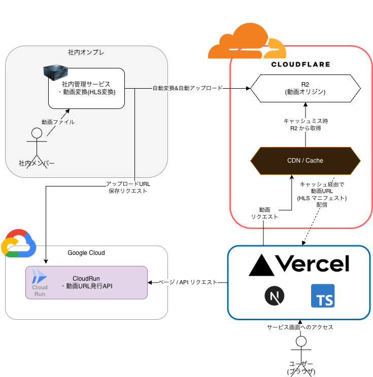 - 動画変換を社内オンプレで対応し、配信部分だけをCloudflareに乗せた点