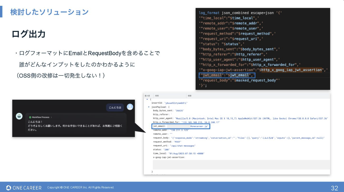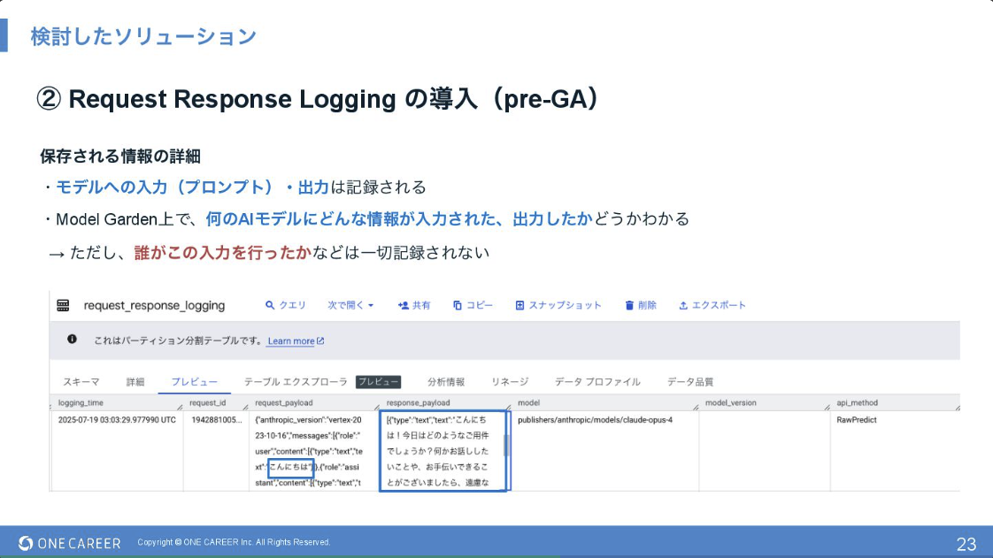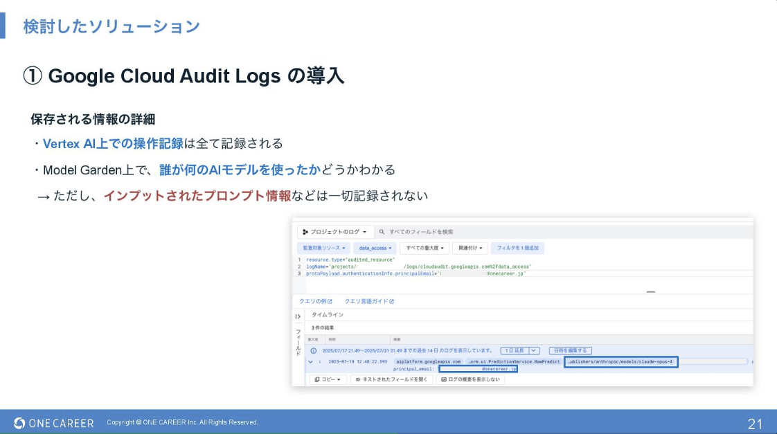「誰が」「どんなデータ」を入力したかを記録できるようになったことで、トレーサビリティを担保しつつ、Cloud LoggingやBigQueryを活用して利用状況を詳細に分析できるようになりました。