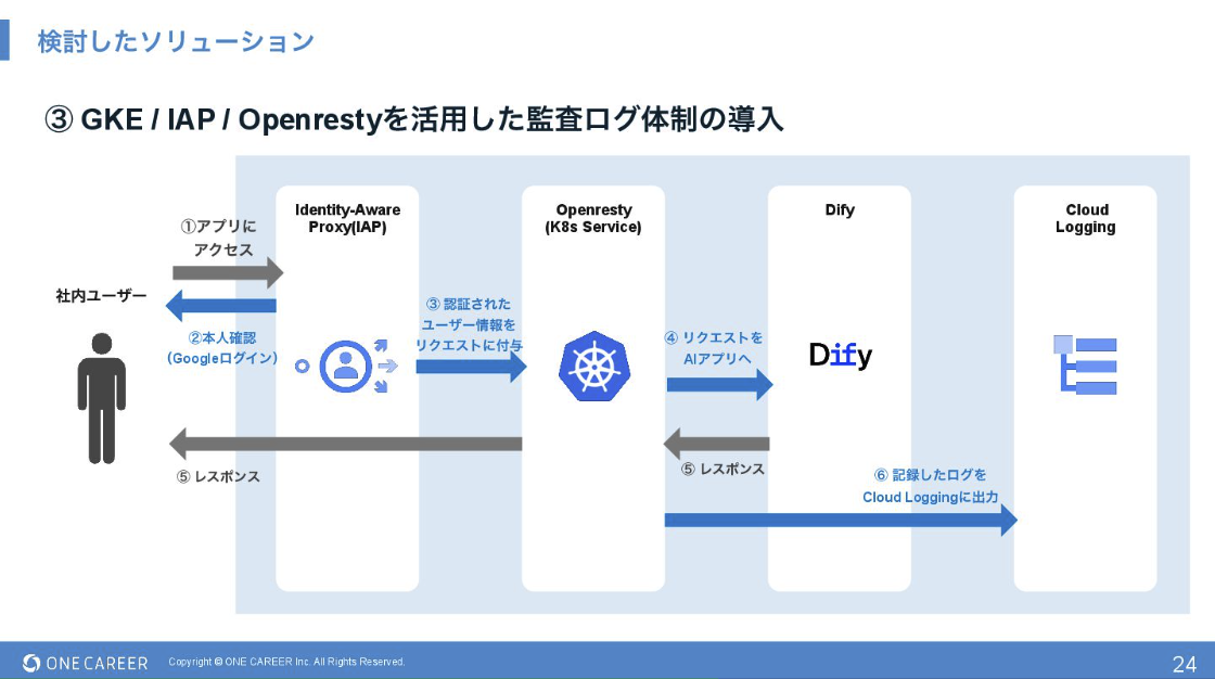 ユーザーからのリクエストは、LB、IAP、OpenResty Serverを経由してAIアプリケーション(Dify)に到達します。