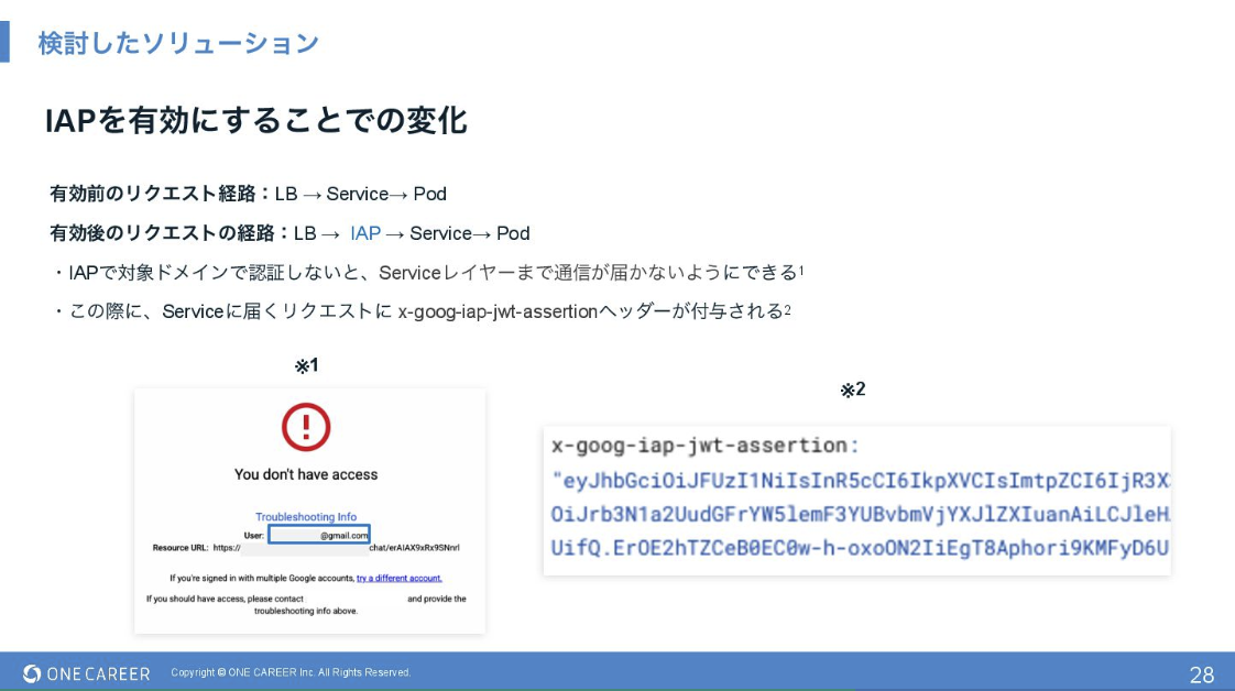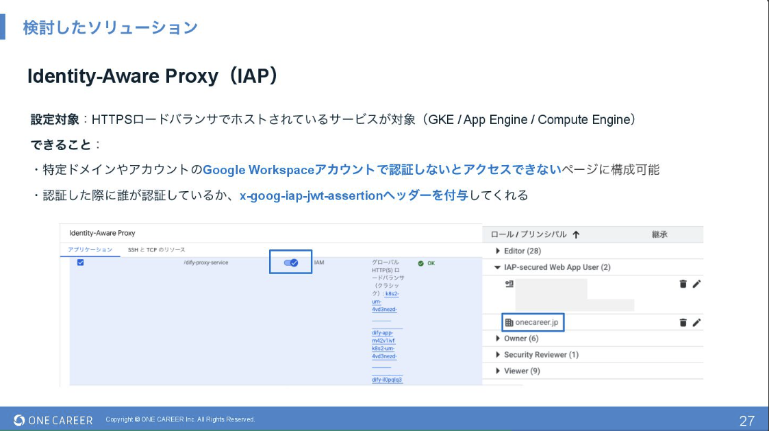 当時(2023年)の当社の新規事業である「ワンキャリア for エンジニア」において、新しい技術に積極的に挑戦し、GKEのようなエンタープライズ向けの企業が導入している標準的な技術を採用することで、今後の移行や組織内での技術的な選択肢を広げていくという点を強調しました。新しいインフラ運用を通じて、社内に知見(ナレッジ)を蓄積することも重要な狙いであることを説明しました。