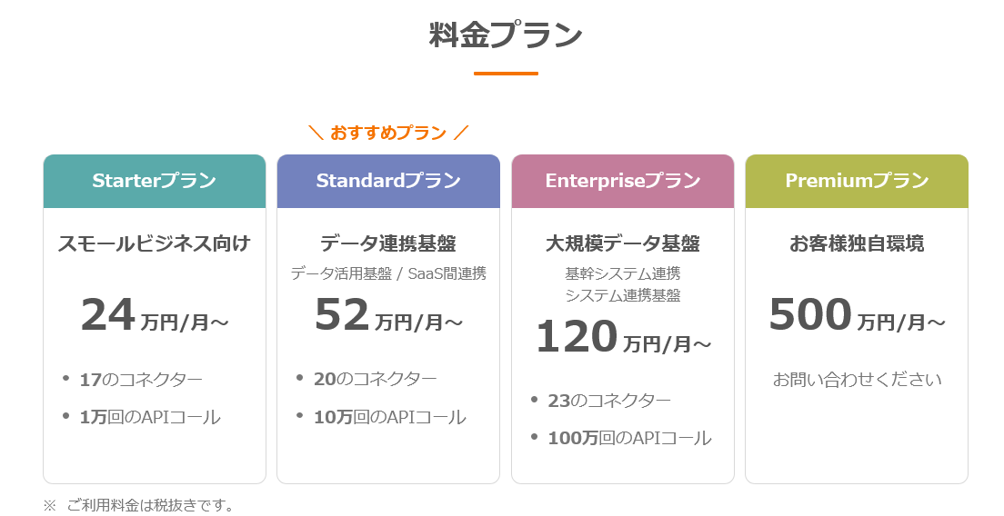 例えば小さく部門内SaaS連携からスタートしてから、大きく全社データ連携基盤としても利用可能です。状況に合わせて拡張可能なサブスクリプションサービス。